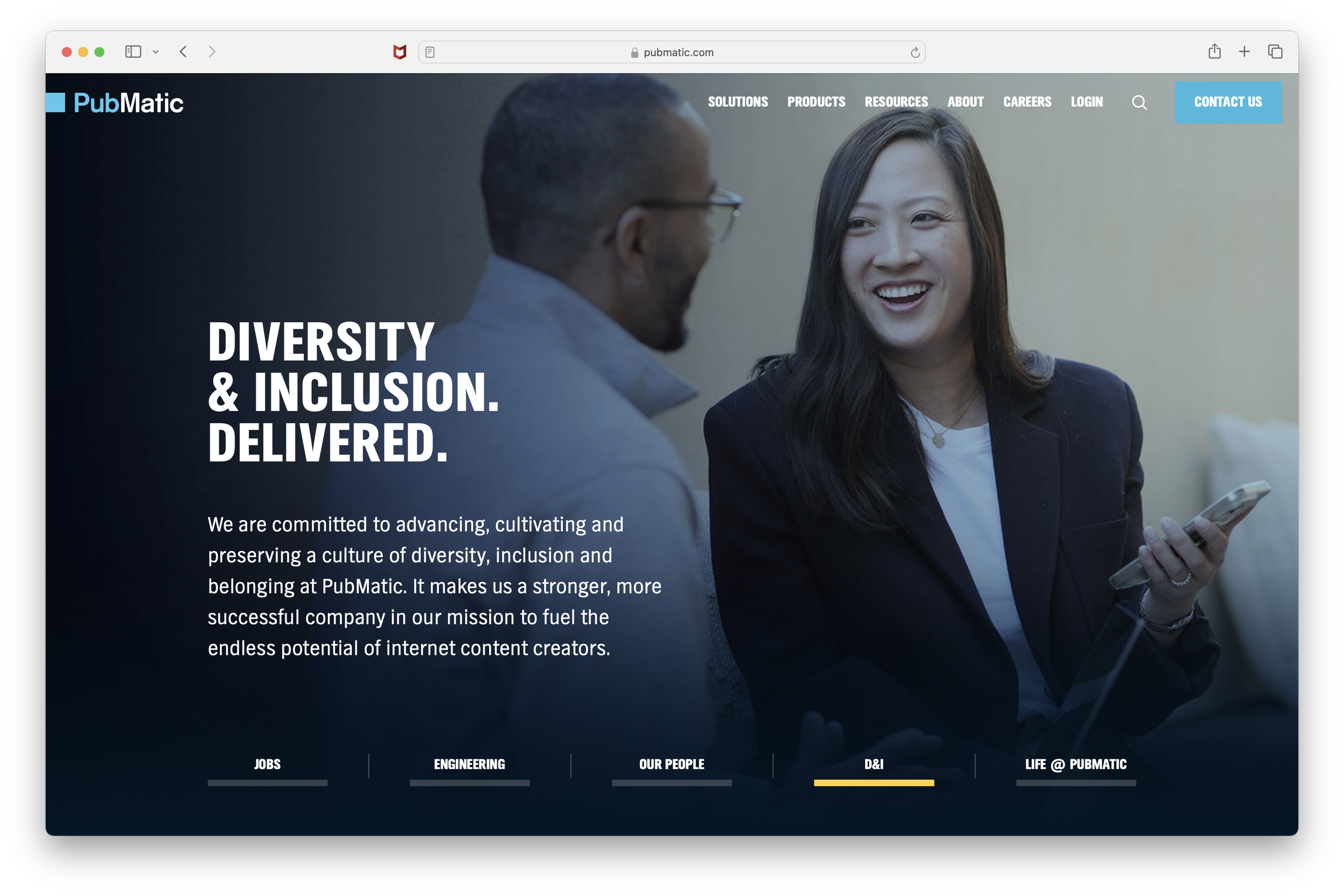 The DEI section does the real work of translating PubMatic's public commitment to diversity into something tangible: employee quotes, ERG programs, the Female Empowerment speaker series, DEI training initiatives, Diversity Reports, and direct ties to the DE&I Council’s Anti-Racism Working Group — a safe space for dialogue, financial pledges, and a DEI Resource Library. Marketing led the strategy in close partnership with HR.