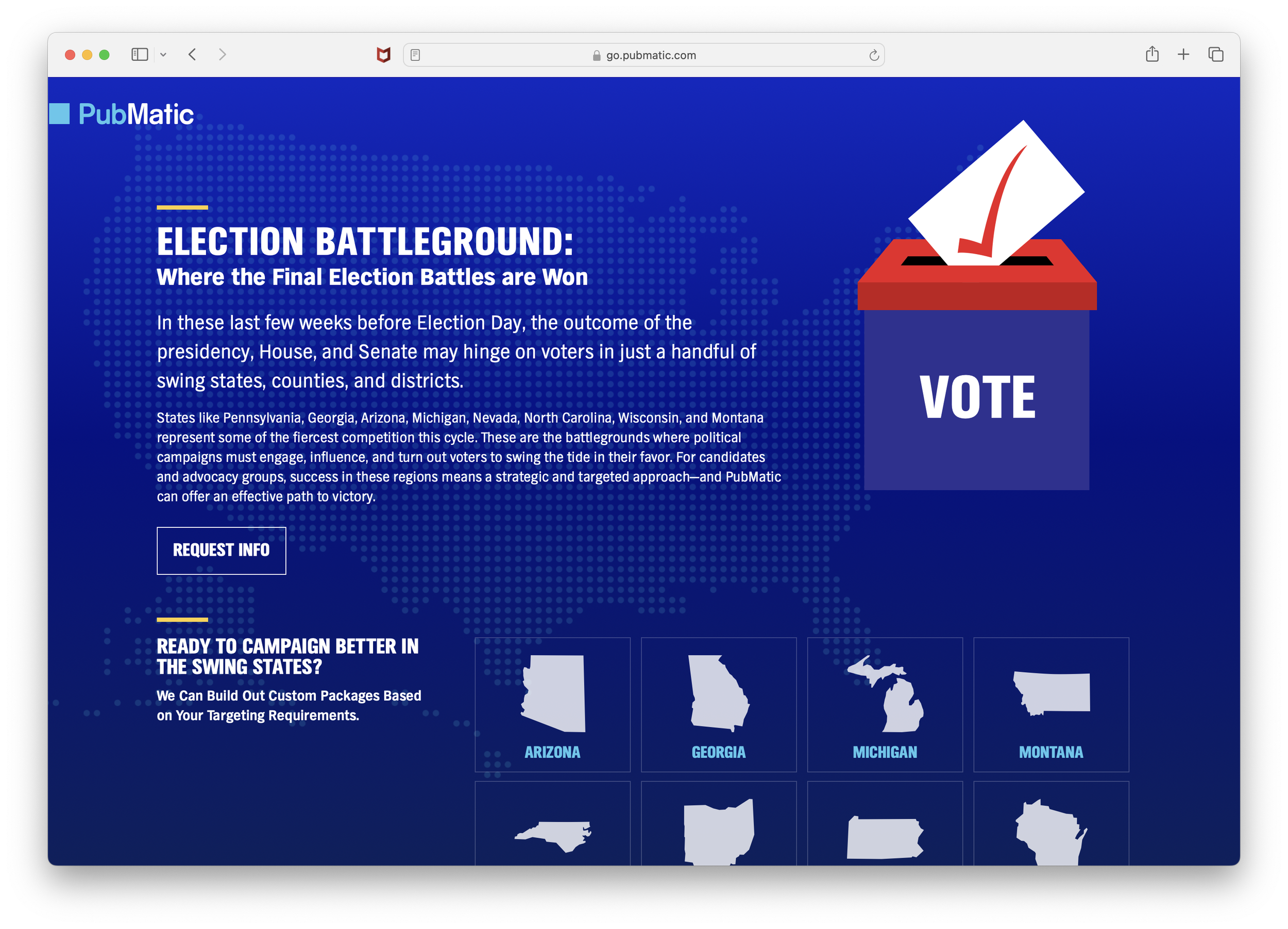 Nearly 88% of political advertising spend between October 10 and November 5 concentrated in a handful of key swing states — and the campaign was built around that reality. State-specific landing pages with tailored copy went live for Pennsylvania, Arizona, Michigan, Wisconsin, Georgia, Nevada, North Carolina, and Montana, alongside a unified All Swing States page for buyers working across markets.