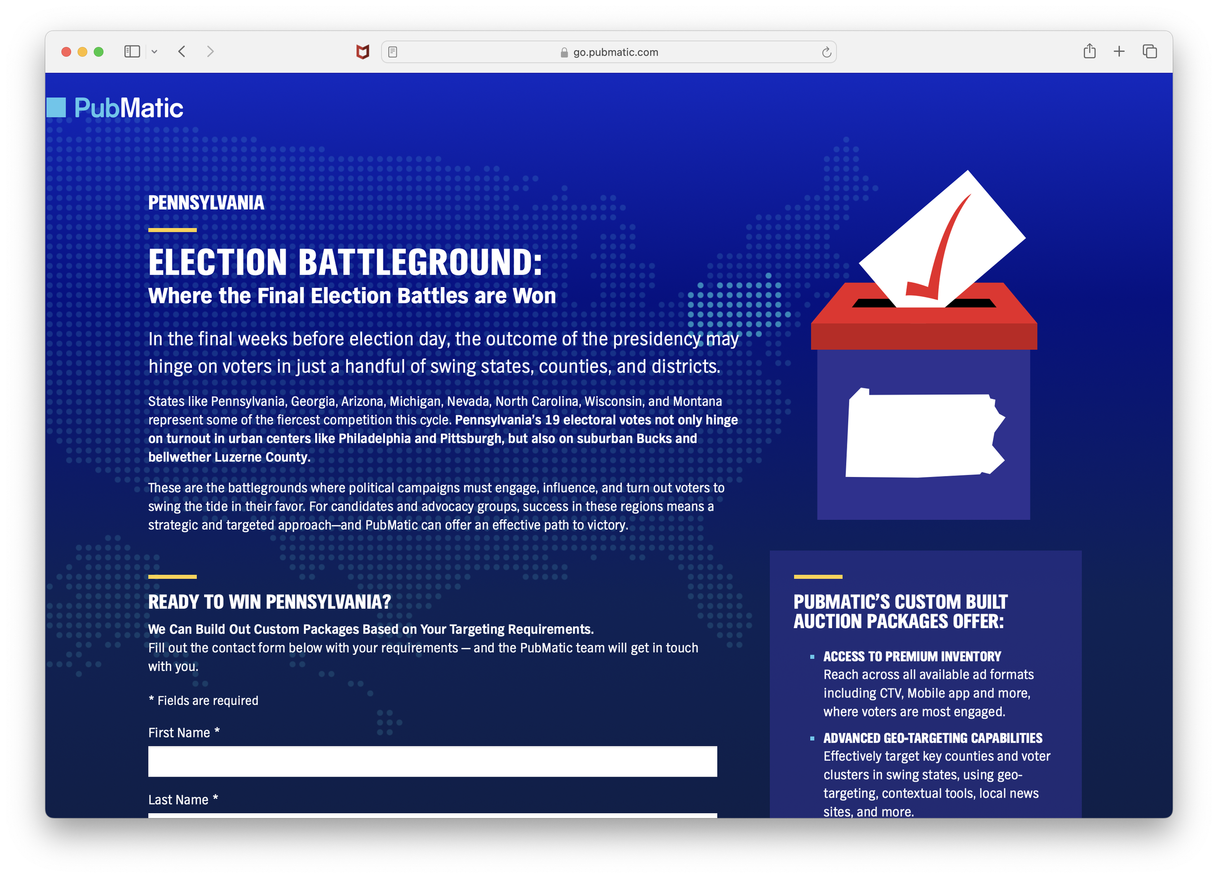 A dedicated Political Advertising Playbook, produced as a thought leadership asset, rounded out the offering — giving the market a guide to navigating political advertising at every stage of the cycle, and positioning PubMatic as a knowledgeable partner, not just a platform.