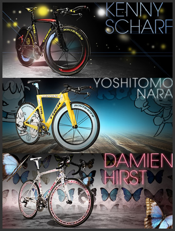 On Trek side (Lance’s been on Trek for-like-ever), there are 6 custom-designed bikes by artists (KAWS, Kenny Scharf, Shepard Fairey, Marc Newson, Yoshitomo Nara and Damien Hirst) to be auctioned on Oct. 2nd in NYC, with proceeds going directly to The Lance Armstrong Foundation to help fund outreach, awareness, research and advocacy. Very cool!